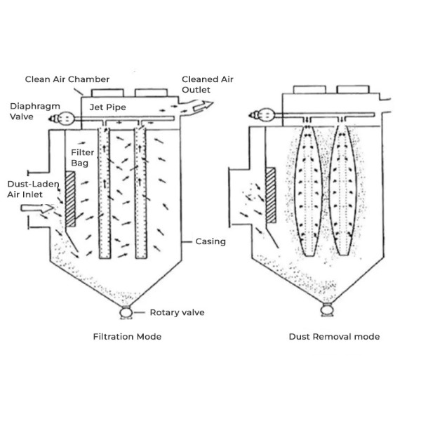 백 필터 집진기는 먼지 입자를 가두는 필터 백을 통해 공기나 가스를 강제로 통과시켜 작동합니다. 청소된 공기는 백을 통과하고, 먼지는 원단 외부에 쌓이게 되며, 원단 외부는 압축공기로 주기적으로 청소됩니다.